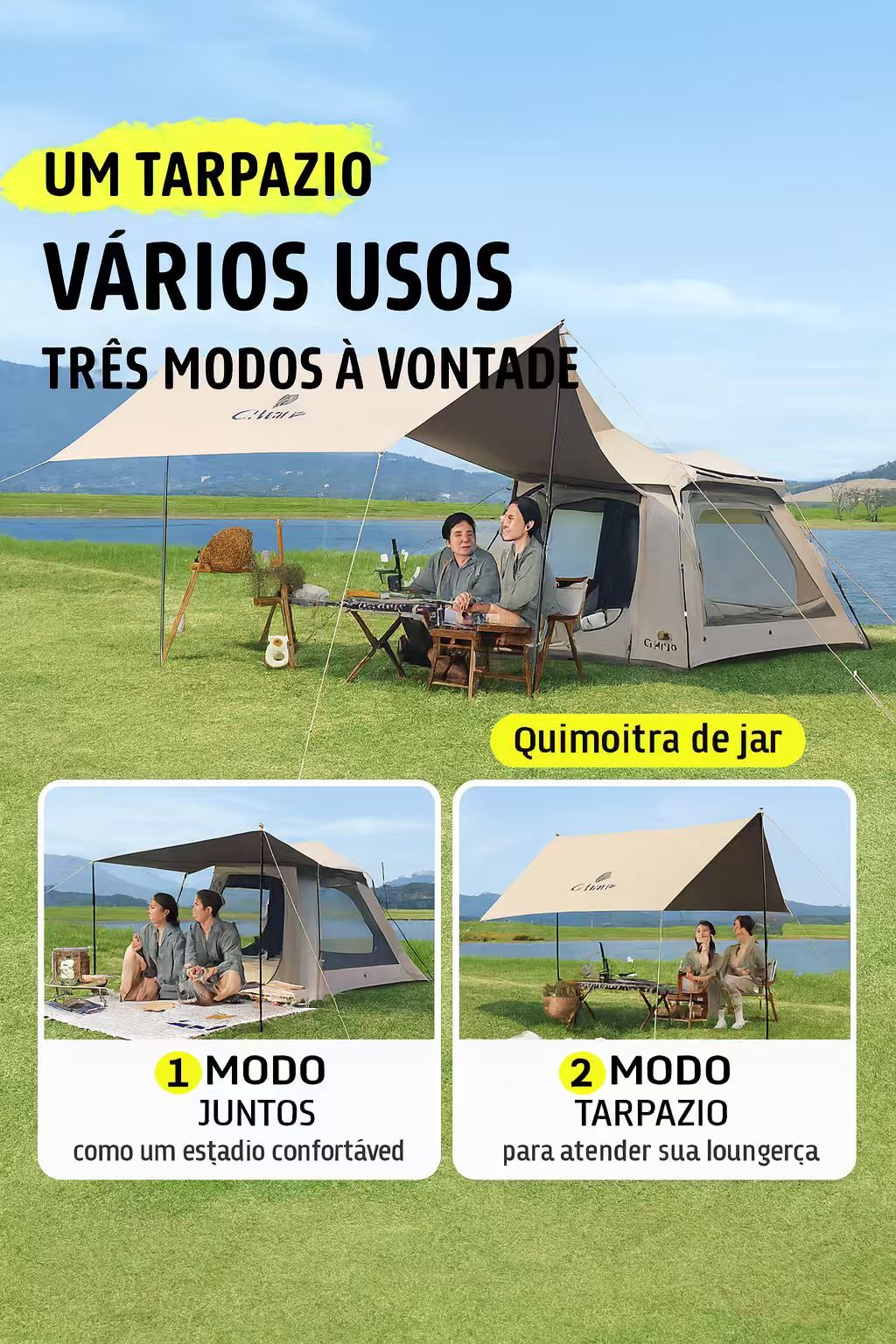 ✔ 1) Modo Lona + Tenda Integrados: Cria uma área de atividades espaçosa + área de descanso, oferecendo proteção contra o sol e o vento, perfeita para acampamentos em família, relaxamento à beira do lago e churrascos ao ar livre.