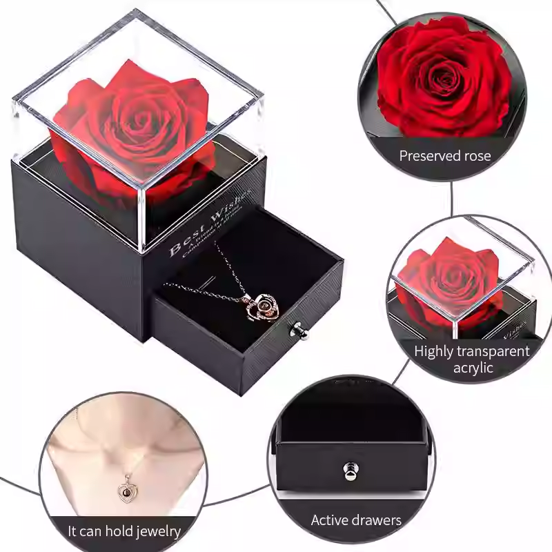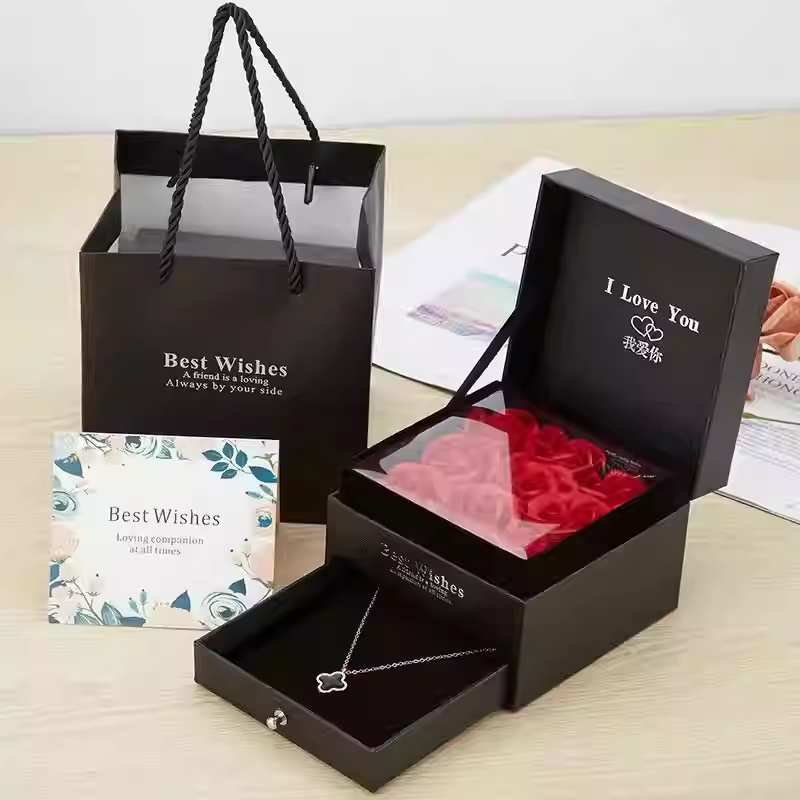Uma caixa premium com rosas decorativas e um colar delicado escondido na gaveta —